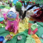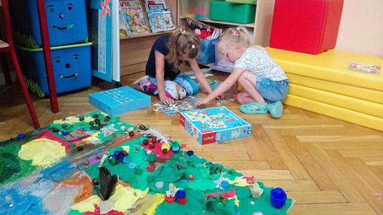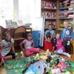 Praca nad projektem wymagała od maluchów współpracy ze sobą. Dzieci dyskutowały i wymieniały się pomysłami, jak mają wyglądać poszczególne części wioski i z wielkim zaangażowaniem pracowały. Efektem jest cudownie bajeczna wioska Smerfów.