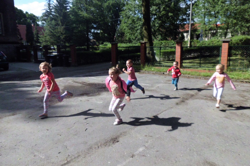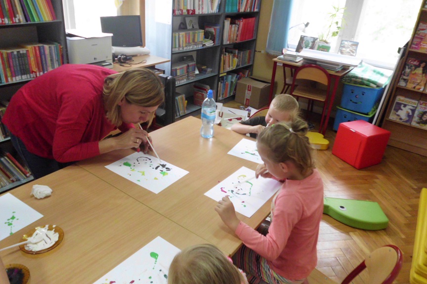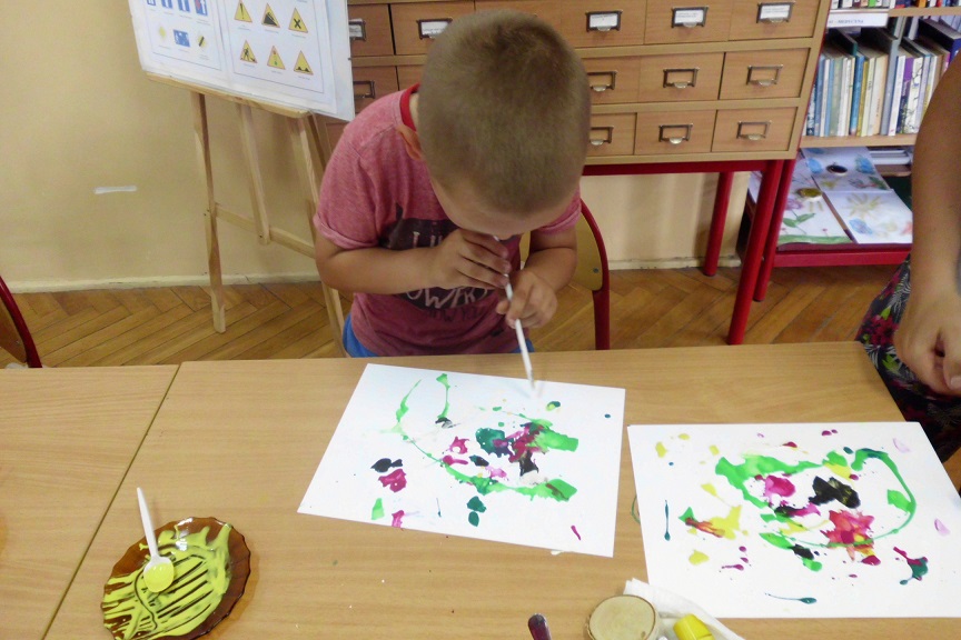 Malowanie farbami, ale nie takie zwykłe, bo przy użyciu słomek do napojów sprawiło dzieciom sporo frajdy. Efektem były śliczne stworki i potworki. Malowanie kredą po kartce? To możliwe, ale jeśli wymoczymy kredę w wodzie z cukrem, kolory będą bardziej wyraziste, a cukier nada ciekawą strukturę. Dzieci udekorowały swoje prace brzozowymi krążkami, dzięki czemu powstały oryginalne i bardzo ciekawe prace. Na koniec zajęć odbyły się zabawy na świeżym powietrzu. Maluchy malowały kredą, grały w Chłopa, Baba-Jagę i inne gry.