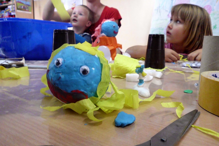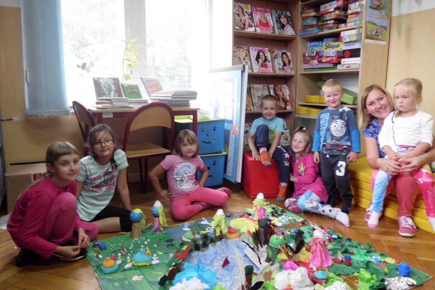 Dwa ostatnie wakacyjne spotkania upłynęły maluchom na tworzeniu makiety wioski Smerfów. W ruch poszły duże i małe kartony, materiały plastyczne, rolki po papierze, pióra, szyszki, patyki i wiele innych materiałów. Z kolei Smerfy powstały z kul styropianowych, plasteliny, bibuły i kubeczków plastikowych. Do budowy domków dzieci wykorzystały kolorową masę solną. W chwilach odpoczynku, szukały inspiracji podczas słuchania opowieści ze „Złotej księgi bajek: przygody Smerfów”.