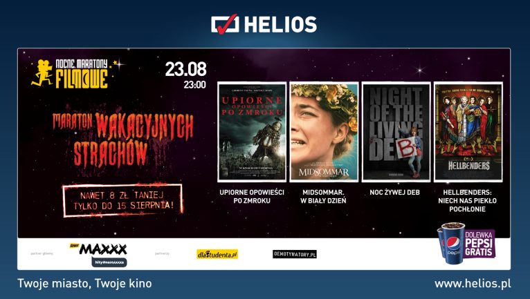 Tym razem strach mieszać się będzie z humorem. Na początek wyświetlony zostanie jeden z najbardziej wyczekiwanych horrorów tego roku – „Upiorne opowieści po zmroku”. Po krótkiej przerwie widzowie obejrzą klimatyczny „Midsommar. W biały dzień”. Następnie pokazane zostaną dwa filmy, w których humor i groza idą w parze, czyli „Noc żywej Deb” oraz „Hellbenders: Niech nas piekło pochłonie”.
