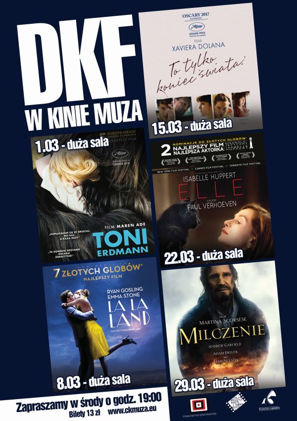 Jak zwykle seanse będą się odbywać w każdą środę o godzinie 19. Na początek, 1 marca, pokazana zostanie produkcja „Toni Erdmann”. Później wyświetlone zostaną filmy: „La la land” (8 marca), „To tylko koniec świata” (15 marca), „Elle” (22 marca) i „Milczenie” (29 marca).