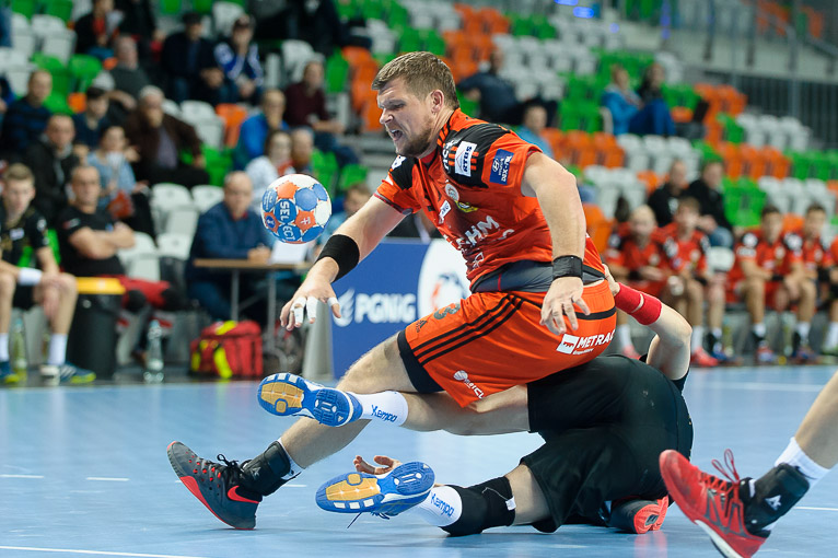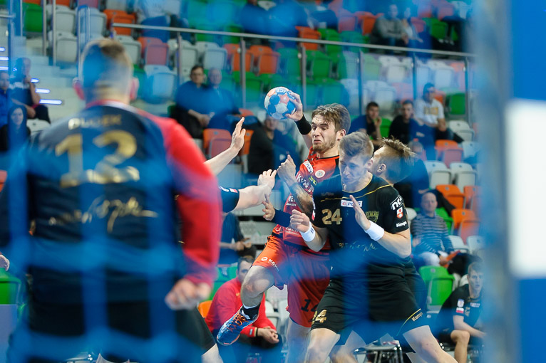 Na prowadzenie miedziowi wyszli w szóstej minucie, kiedy ze skrzydła rzucił Łukasz Kużdeba. Dwie minuty później o czas poprosił trener zespołu gości, Jacek Będzikowski. Dobrze grające w obronie Zagłębie prowadziło 3:1 i nie zamierzało na tym poprzestawać. W bramce kolejne piłki odbijał Patryk Małecki, a jego koledzy skutecznie kończyli kolejne akcje ofensywne. W dziesiątej minucie gospodarze prowadzili już 5:1. W kolejnych fragmentach meczu lepiej prezentowali się goście, którzy zniwelowali straty do dwóch bramek – 6:4 w 15. minucie. Później znów do głosu doszli lubinianie, którzy postawili mur w obronie, co pozwoliło wyprowadzać kontry, z których najczęściej trafiali skrzydłowi. Sześć minut przed końcem pierwszej połowy na tablicy wyników było 11:6, a do przerwy podopieczni Pawła Nocha i Adriana Anuszewskiego wygrywali 16:9!