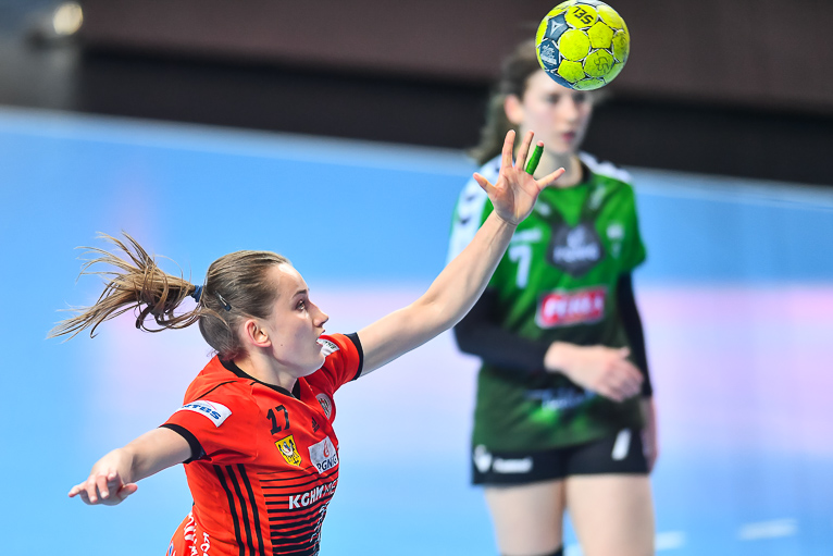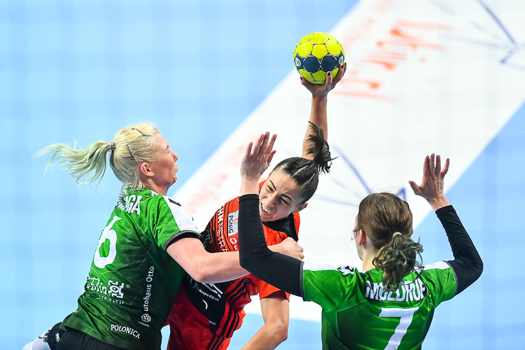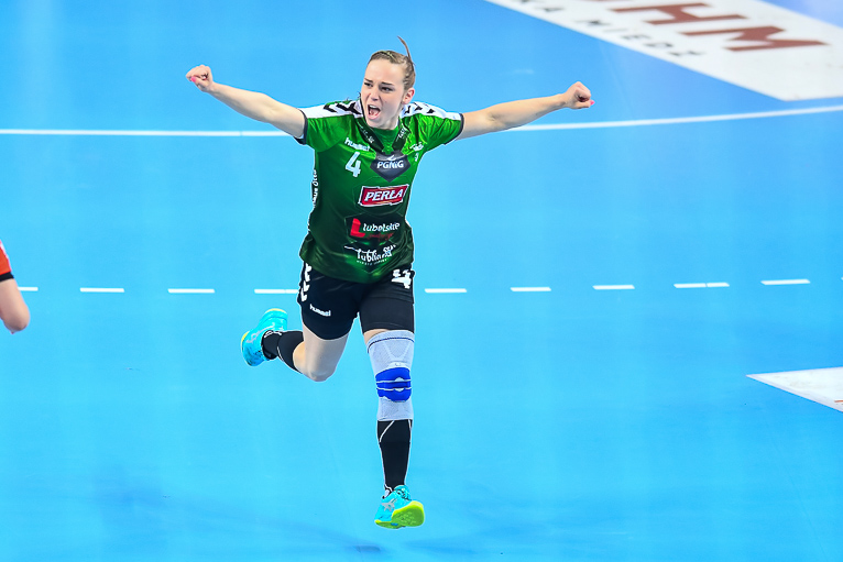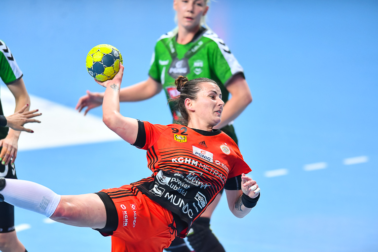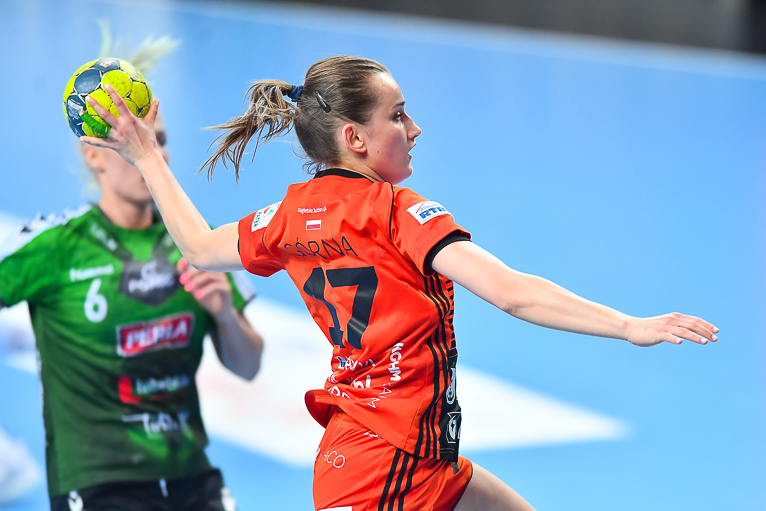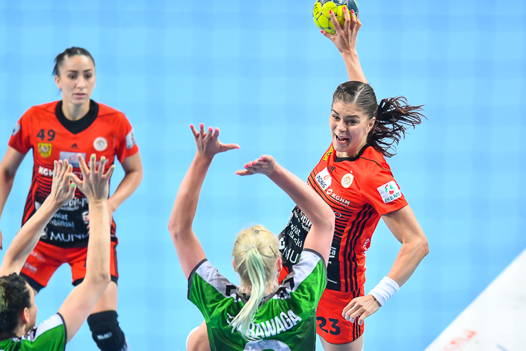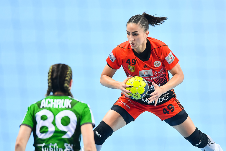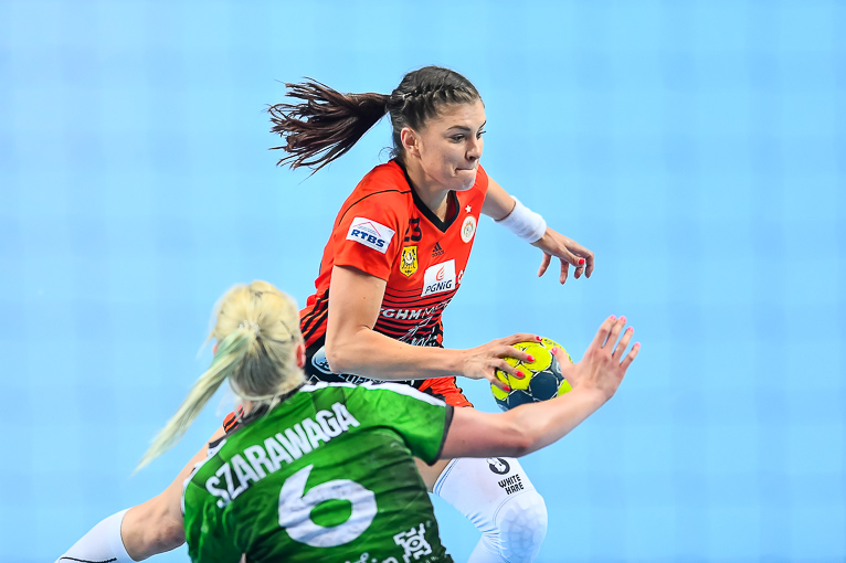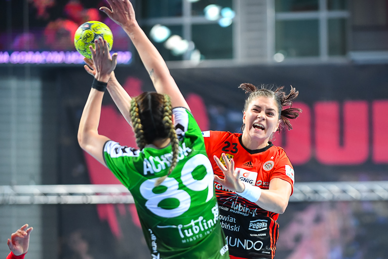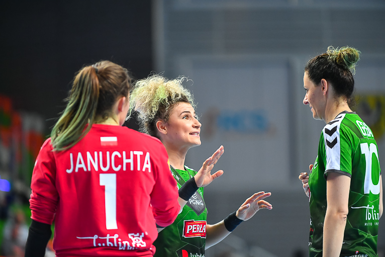 Mecz dwóch najlepszych drużyn zaczął się od trafienia Joanny Szarawagi, ale Miedziowe za sprawą Klaudii Pielesz szybko wyrównały. W ósmej minucie na tablicy wyników znów był remis, tym razem 3:3. Obie drużyny grały uważnie w obronie i starały się nie popełniać błędów. Zespół z Lubelszczyzny w krótkim czasie dorzucił dwie bramki i zrobiło się 3:5. Chwilę później to lubinianki były na prowadzeniu, rzucając trzy bramki z rzędu i łapiąc przy tym wiatr w żagle. Na parkiecie szalała skrzydłowa Miedziowych Adrianna Górna, która po dwudziestu minutach miała na swoim koncie już pięć trafień, a Metraco Zagłębie prowadziło 12:8. Do końca pierwszej połowy podopieczne Bożeny Karkut i Renaty Jakubowskiej utrzymywały 3-4 bramkową przewagę i do szatni schodziły przy wyniku 16:13.