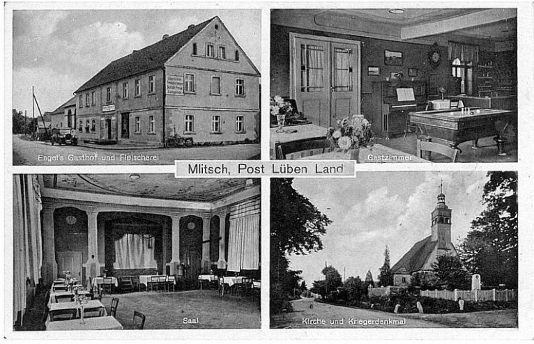 Kolejna czteroobrazkowa pocztówka z Mleczna (Mlitsch), na której widzimy, patrząc od góry, z lewej strony gospodę i sklep mięsny Engela. Reklama namalowana na budynku poleca posiłki, wolne pokoje, solidną cenę i garaż dla zmotoryzowanych. Sala klubowa w gospodzie wygląda nad wyraz elegancko. Sala restauracyjna przestronna, z niemałą sceną pozwalała na występy zespołów teatralnych i trup cyrkowych. Przy kościele uwagę zwraca pomnik poświęcony poległym na frontach I wojny światowej mieszkańcom miejscowości.