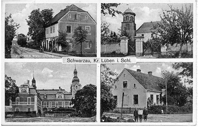 Wieś Czerniec – Schwarzau, położona jest około 7 km na wschód od Lubina. Na czteroobrazkowej pocztówce widzimy: u góry po lewej – sklep wiejski Jichmanna, po prawej kościół (murowany), obok dzwonnica (drewniana). Na dole od lewej: piękny barokowy pałac, a po prawej szkoła ludowa.