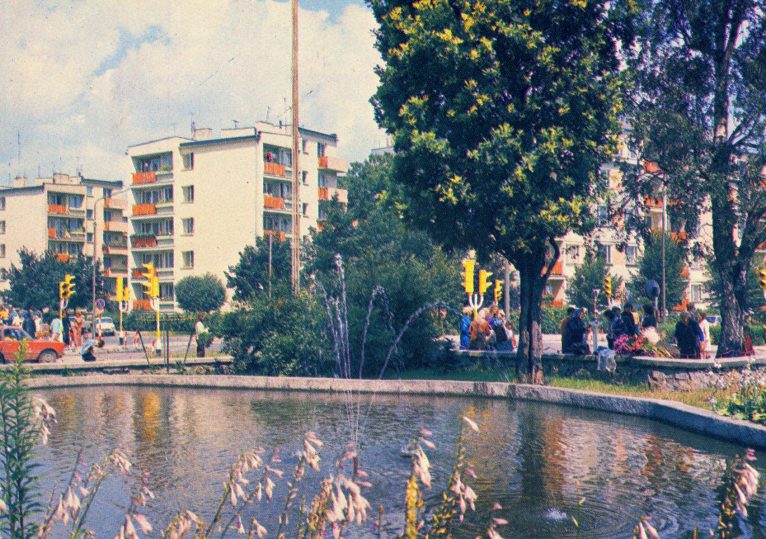 Pocztówka ukazującą fragment ulicy Tysiąclecia z fontanną przed ówczesnym Domem Towarowym. Obecnie w jej miejscu znajduje się parking samochodowy.