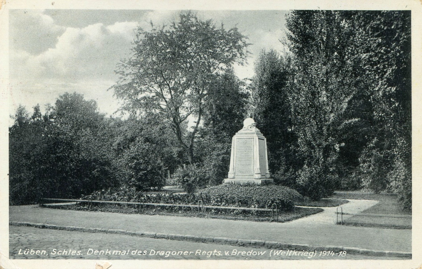 Na pocztówce widoczny jest pomnik poświęcony dragonom Pułku von Bredow, którzy polegli w Wielkiej Wojnie w latach 1914-1918. Pomnik znajdował się przy ówczesnej Bahnhofstrasse (dziś ul. Odrodzenia), naprzeciw późniejszego kina Deli (Polonia).