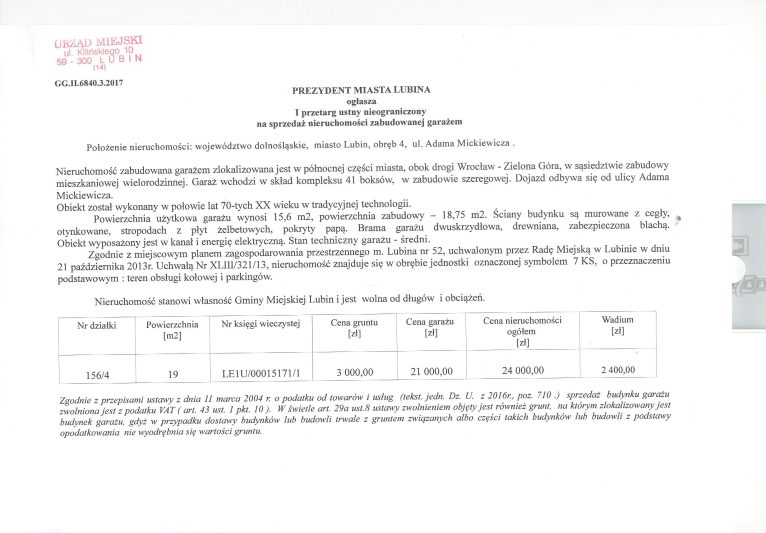 Urząd miasta ogłasza I przetarg ustny nieograniczony na sprzedaż nieruchomości zabudowanej garażem.
