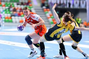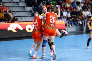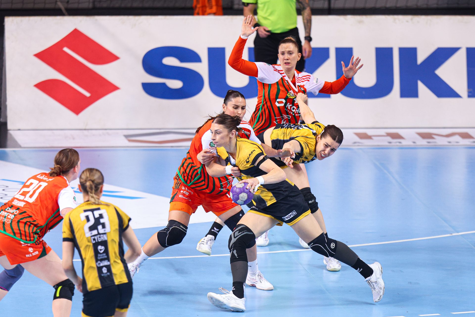 Mecz lepiej rozpoczął się dla przyjezdnych, które już po kilku minutach objęły prowadzenie 3:1, wykorzystując chwilową nieskuteczność gospodyń. Z biegiem czasu inicjatywę zaczęły jednak przejmować Miedziowe. Podopieczne Bożeny Karkut i Renaty Jakubowskiej z minuty na minutę grały coraz pewniej i skuteczniej, szybko doprowadzając do wyrównania, a następnie obejmując prowadzenie 4:3. Kolejne trafienia Natalii Janas, Joanny Drabik i Kingi Grzyb, w połączeniu ze świetną postawą Barbary Zimy między słupkami, pozwoliły gospodyniom zbudować wyraźną przewagę. Jeszcze przed 20. minutą było już 10:5 dla KGHM Zagłębia, które narzuciło rywalkom swój rytm gry. Do końca pierwszej połowy obraz spotkania nie uległ zmianie – lubinianki dominowały zarówno w ataku, jak i w obronie, schodząc do szatni z pewnym prowadzeniem 13:7.