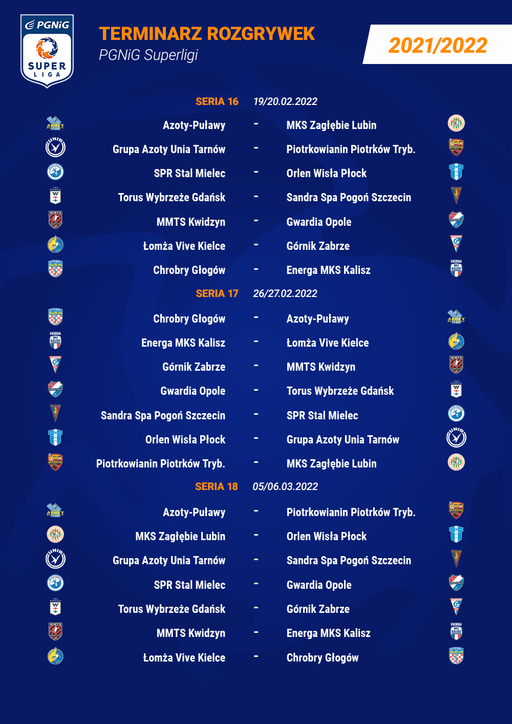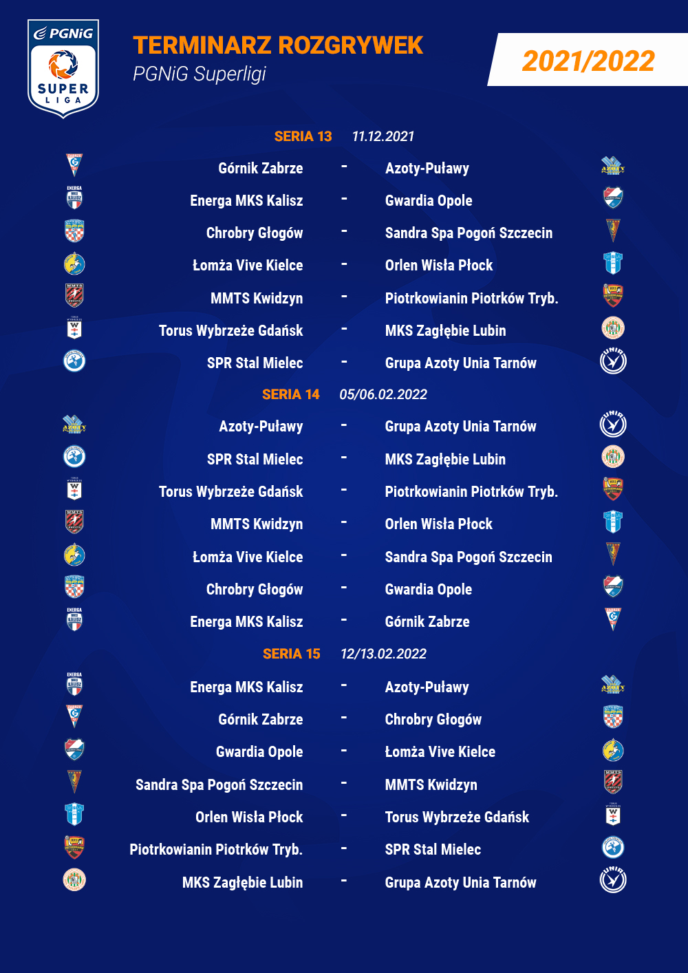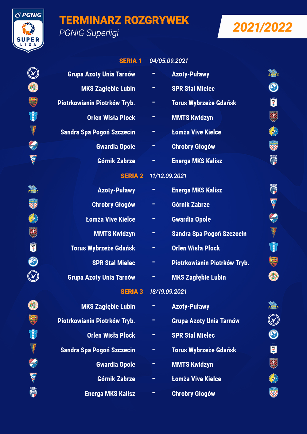 W rozgrywkach PGNiG Superligi wystartuje 14 klubów, które w trakcie sezonu rozegrają 26 serii podzielonych na dwie rundy. Pierwsza z nich rozpocznie się już 4 września. Ostatnia seria I rundy zostanie rozegrana w sobotę, 11 grudnia. Następnie kluby czeka przerwa w rozgrywkach. Jest ona związana ze startem biało-czerwonych w turnieju Mistrzostw Europy, który odbędzie się w styczniu na Węgrzech i Słowacji.