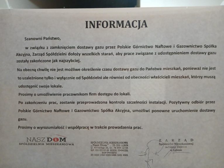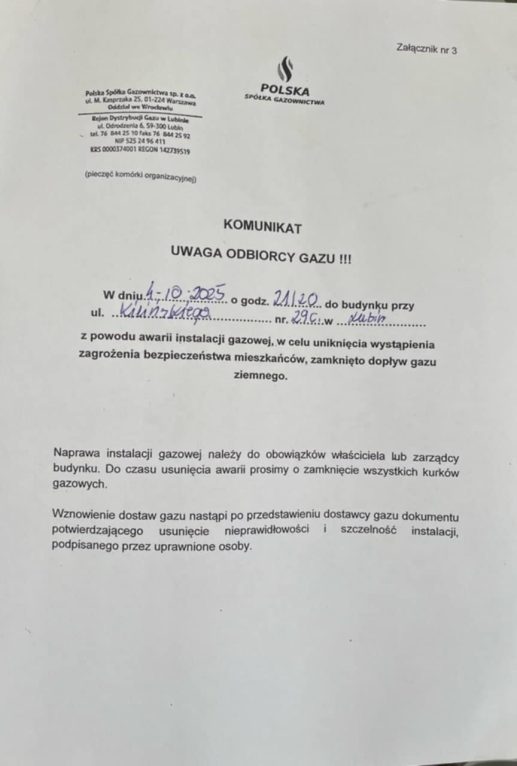 – W związku z kontrolą przeprowadzoną przez Polską Spółkę Gazownictwa w jednym z budynków, stwierdzono nieszczelność instalacji gazowej, co wymusiło konieczność odcięcia dopływu gazu do całego pionu – czytamy w komunikacie. Zaznaczono w nim także, że przywrócenie dostaw będzie możliwe dopiero po przeprowadzeniu prób szczelności i ponownym odbiorze technicznym.