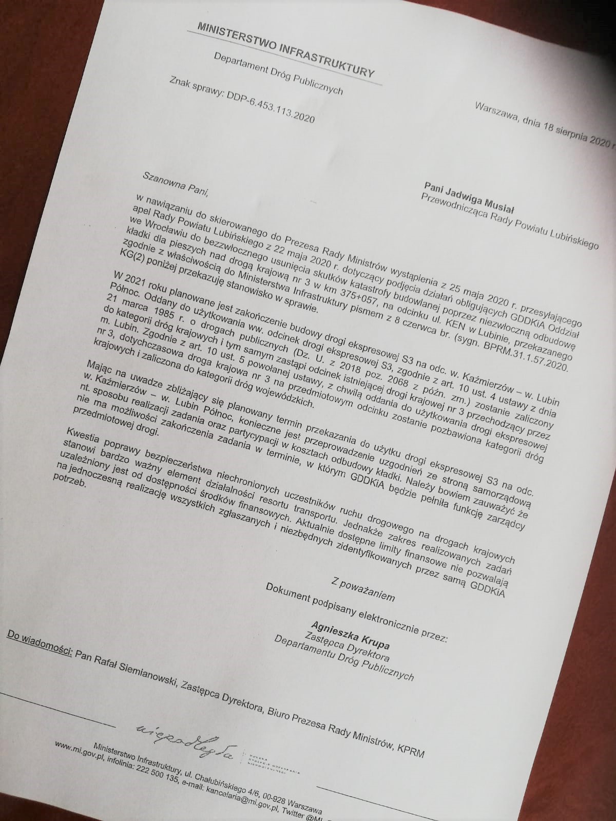 Radni powiatowi właśnie otrzymali z Ministerstwa Infrastruktury odpowiedź na swój apel, który wysłali do premiera. Wynika z niej jasno, że GDDKiA nie podejmie żadnych działań jeśli chodzi o kładkę w Lubinie. W 2021 roku ma się bowiem zakończyć budowa drogi S3 na odcinku Kazimierzów – Lubin, a wtedy ulica KEN straci status drogi krajowej (zyska go S3) i automatycznie stanie się drogą wojewódzką, a wraz z nią uszkodzona i wyłączona z ruchu kładka. Zniszczona konstrukcja stanie się wtedy problemem samorządu województwa dolnośląskiego.