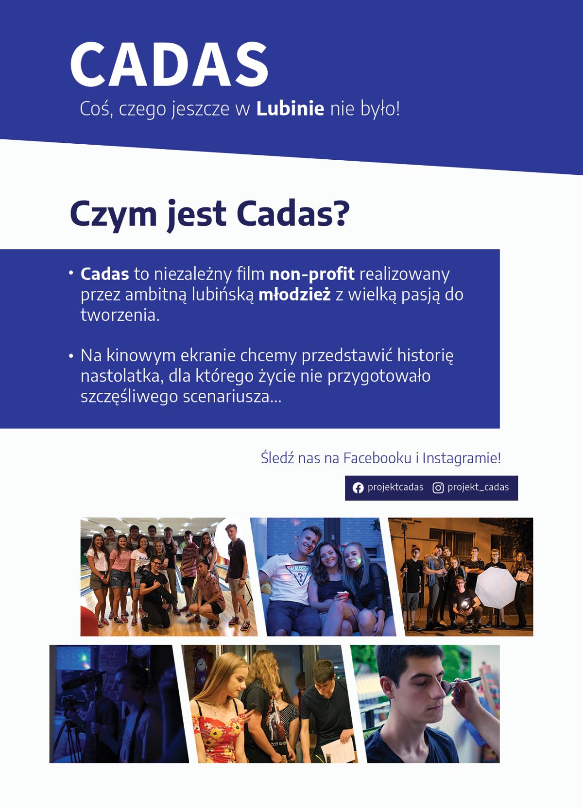 Już w lutym będzie można zobaczyć efekty pracy grupy młodych filmowców z Lubina. Najpierw odbędzie się premiera w kinie Muza, a kilka godzin później w internecie. – Jestem zadowolony z wyników i mam nadzieję, że widzom film też się spodoba. Produkcja nie powstała po to, byśmy na niej zarobili, ale chcemy wpłynąć na ludzi, żeby się zastanowili nad tym, jak postępują – mówi o projekcie „Cadas” reżyser, scenarzysta i pomysłodawca filmu Michał Cywiński.
