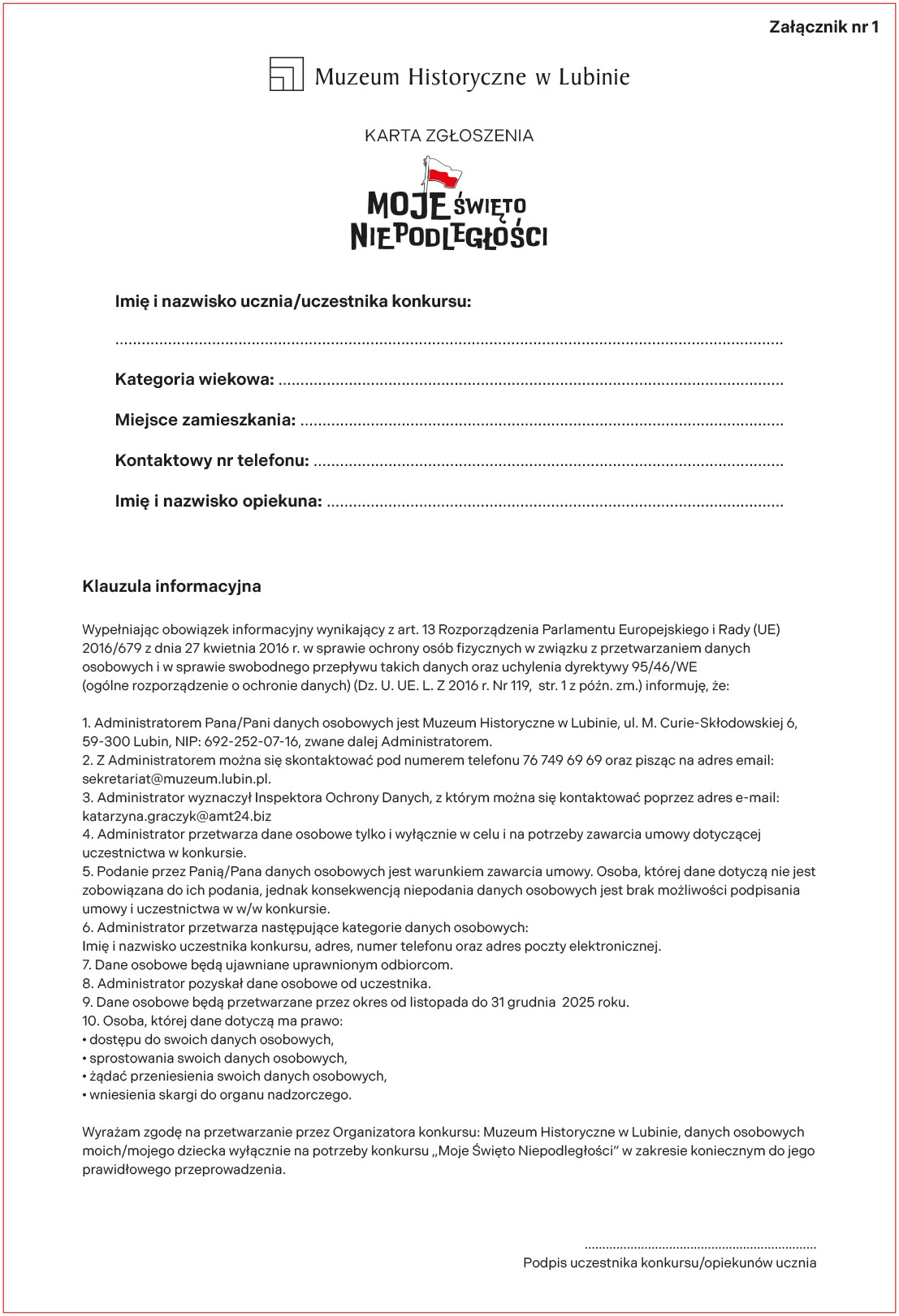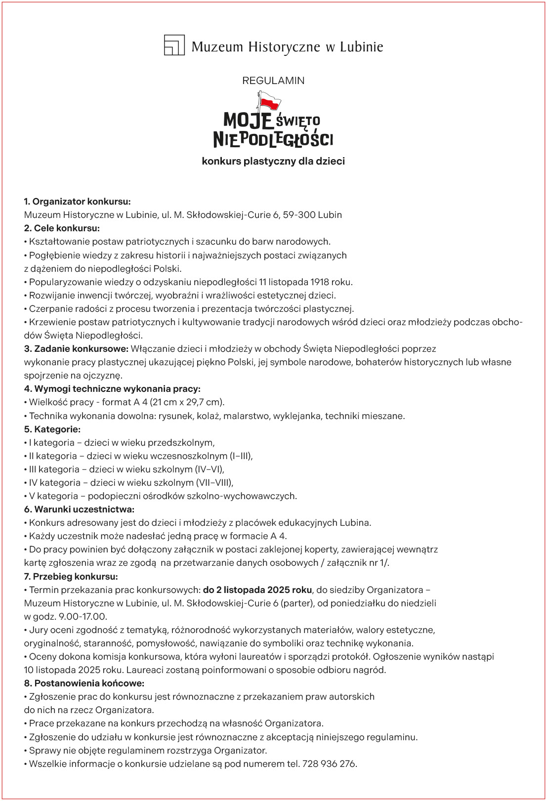 Z okazji Narodowego Święta Niepodległości Muzeum Historyczne w Lubinie zaprasza dzieci i młodzież z lubińskich placówek edukacyjnych do udziału w konkursie plastycznym „Moje Święto Niepodległości”.