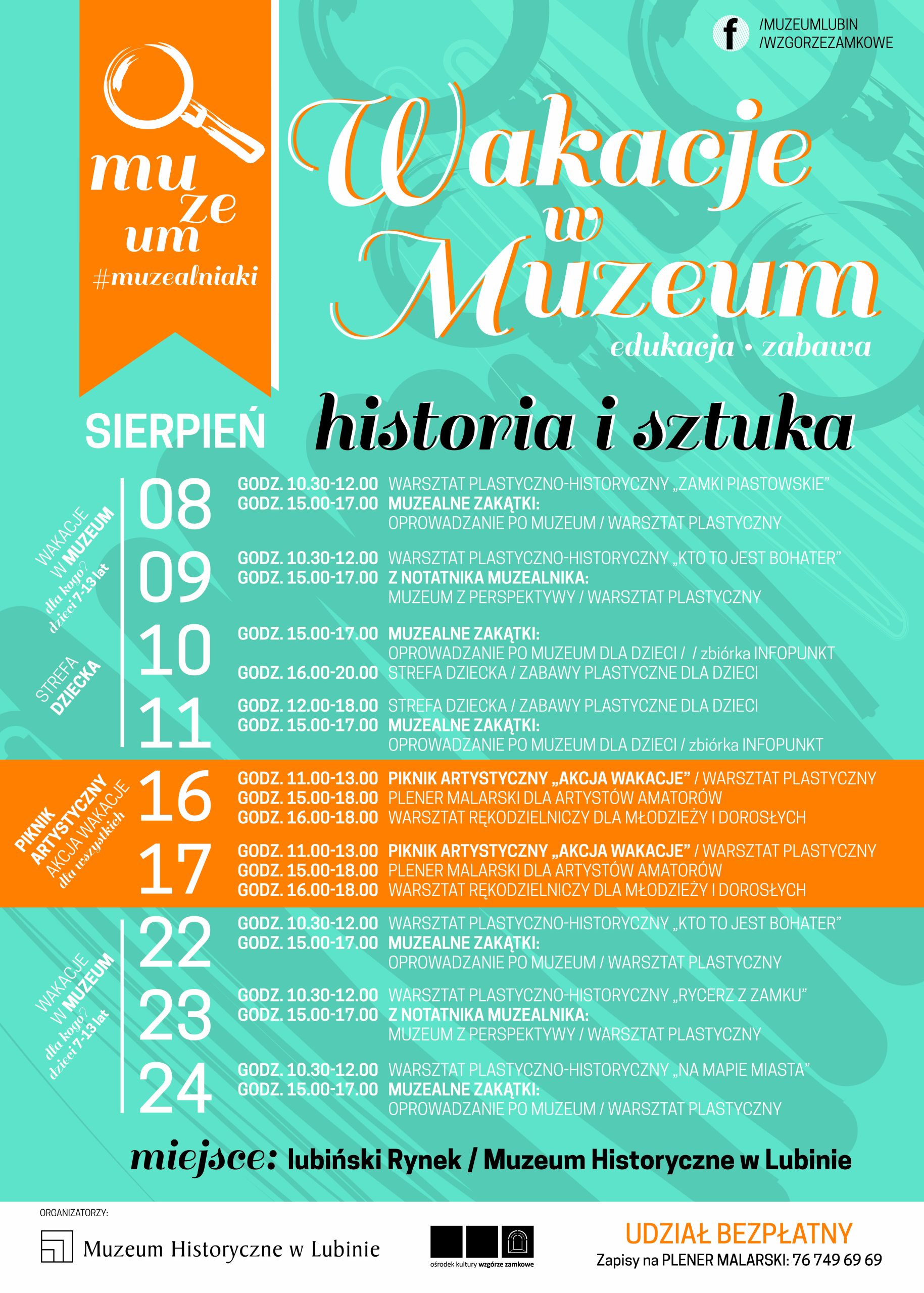 Kolejna impreza to „Piknik Artystyczny” skierowany do młodzieży i dorosłych, który będzie miał miejsce 16 i 17 sierpnia. W programie organizatorzy zaplanowali warsztaty plastyczne dla najmłodszych, warsztaty rękodzielnicze dla młodzieży i dorosłych oraz plener malarski kierowany do artystów amatorów z terenu Lubina i okolic. Dokładna zapowiedź „Pikniku Artystycznego” wkrótce.