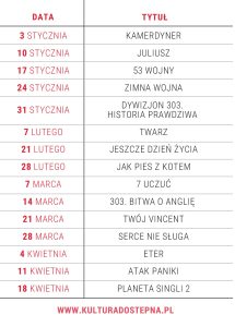 Styczniowe seanse przeniosą widzów w wojenny klimat pierwszej połowy XX wieku. „Dywizjon 303. Historia prawdziwa” przybliży losy polskich lotników, walczących o Anglię w czasie II wojny światowej, a „Kamerdyner” z Januszem Gajosem i Sebastianem Fabijańskim – pokaże poruszającą historię splątanych losów Polaków, Kaszubów i Niemców. Wzruszający dramat „53 wojny” opowie natomiast o korespondencie wojennym i jego żonie, która traci nadzieje, że go jeszcze zobaczy… W styczniu nie zabraknie też znanej z poprzedniej edycji „Zimnej wojny”. Dla rozluźnienia warto się będzie wybrać na bardzo pozytywną komedię „Juliusz” z Wojciechem Mecwaldowskim w roli tytułowej.