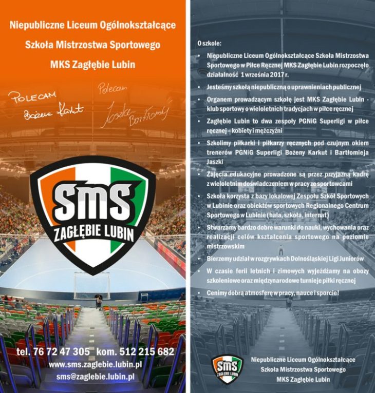 Niepubliczne Liceum Ogólnokształcące Szkoła Mistrzostwa Sportowego MKS Zagłębie Lubin ogłasza nabór SMS klas I o profilu piłka ręczna chłopcy i dziewczęta rocznik 2005.