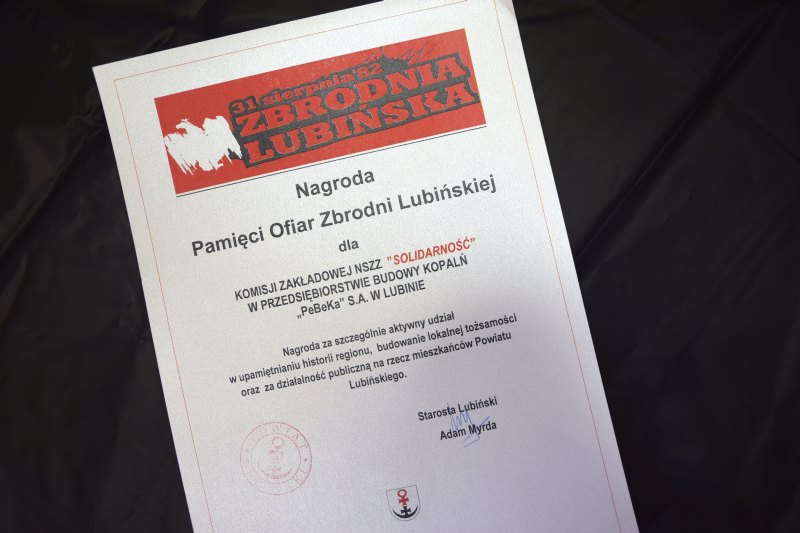 Od 4 lat starosta lubiński wyróżnia osoby, organizacje, zakłady, które kultywują, pamiętają i nie pozwalają, żeby zapomnieć o tragicznych wydarzeniach z 1982 roku. W imieniu Komisji Zakładowej NSZZ Solidarność PeBeKa S.A. w Lubinie statuetkę odebrał przewodniczący Komisji Zakładowej Ireneusz Pasis.