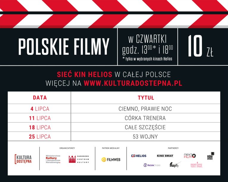 W cztery lipcowe czwartki w lubińskim kinie Helios zagoszczą najbardziej cenione przez krytyków polskie produkcje. W ramach projektu Kultura Dostępna wyświetlone zostaną: „Ciemno, prawie noc”, „Córka trenera”, „Całe szczęście” oraz „53 wojny”.