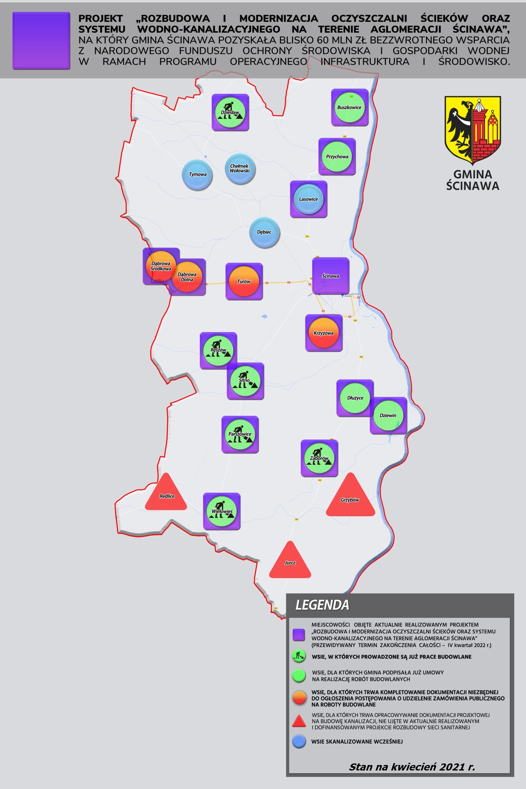 Do dzisiaj zawarto kontrakty z wykonawcami robót budowlanych dla skanalizowania 10 wsi, z czego w 6 miejscowościach, nie licząc samej Ścinawy, rozpoczęły się już i prowadzone są prace w terenie. Łączna wartość podpisanych umów sięga prawie 100 mln złotych. Wszystko inwestowane jest w podstawową infrastrukturę, na którą mieszkańcy czekali od dziesięcioleci.