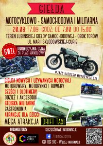 Dwa tygodnie później – 20 sierpnia – na terenie giełdy powstanie wielki tor driftowy. Wszystko w ramach giełdy militarno-motocyklowo-samochodowej. Oprócz jazdy autami do driftu, będzie też wiele innych atrakcji dla tych dużych i dla trochę mniejszych fanów motoryzacji: będzie można kupić nowe i używane motocykle, motorynki i rowery, a do tego części, ubrania i akcesoria. Pojawią się też stoiska militarne i atrakcje dla dzieci.