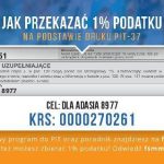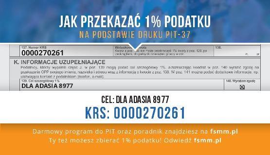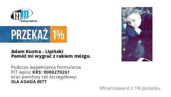 Liczy się każda złotówka. Jeśli ktokolwiek chciałby wesprzeć młodego sportowca, może przekazać mu 1% podatku: Adam Kustra – Lipiński. KRS: 0000270261. W rubryce cel szczegółowy wpisując: Dla Adasia 8977. Można również przelać pieniądze indywidualnie, za pomocą płatności on-line, PayU, czy tradycyjnym przelewem na konto bankowe: 55 1680 1017 0000 3000 1614 5263 PLUS BANK S.A., w tytule wpisując: Dla Adasia 8977.
