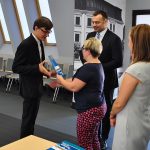 Burmistrz Krystian Kosztyła, przewodnicząca Komisji Zdrowia, Pomocy Społecznej i Oświaty Agnieszka Parzyńska oraz kierownik Referatu Organizacyjnego, Sprawa Obywatelskich i Oświaty Ewelina Maksymczak nagrodzili uczniów za wyniki w nauce oraz osiągnięcia sportowe i artystyczne.