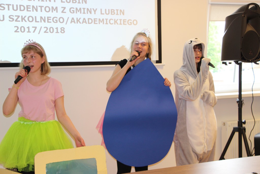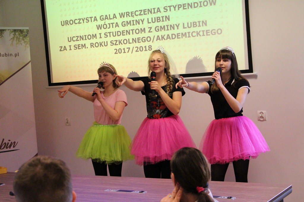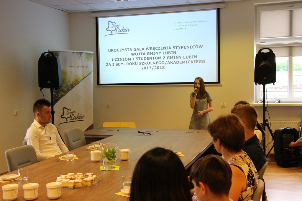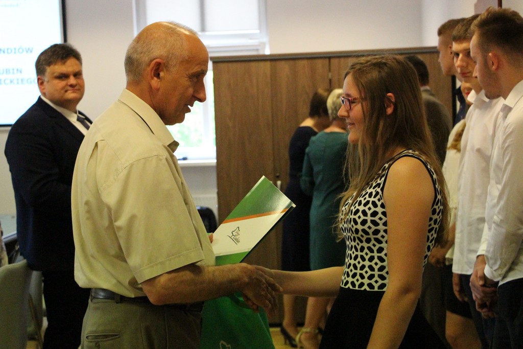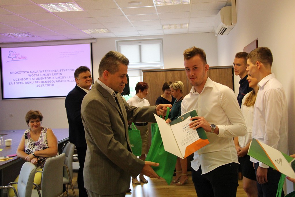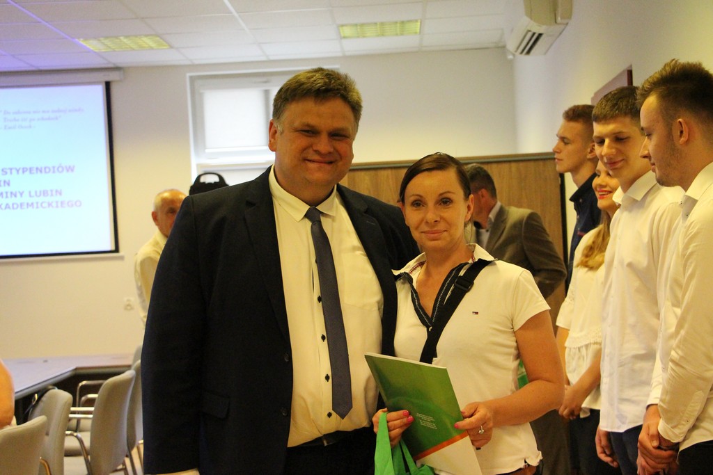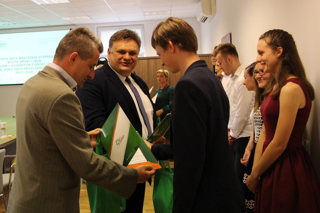 W imieniu wójta gminy Lubin stypendia wręczali przewodniczący rady gminy Lubin Norbert Grabowski, wiceprzewodniczący Marcin Nyklewicz, Zofia Marcinkiewicz przewodnicząca komisji Oświaty oraz Jan Olejnik, członek komisji Oświaty.