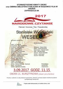 Stowarzyszenie „Kwiaty Obory” oraz Gminna Biblioteka Publiczna w Raszówce zapraszają na Narodowe Czytanie 2017. Gminny finał tegorocznej edycji odbędzie się 3 września w Oborze przy ul. Bursztynowej. W inscenizacji wezmą udział mieszkańcy wsi oraz m. in. ksiądz proboszcz Paweł Kajl, wójt gminy Lubin Tadeusz Kielan oraz sołtys Łukasz Kurowski.