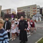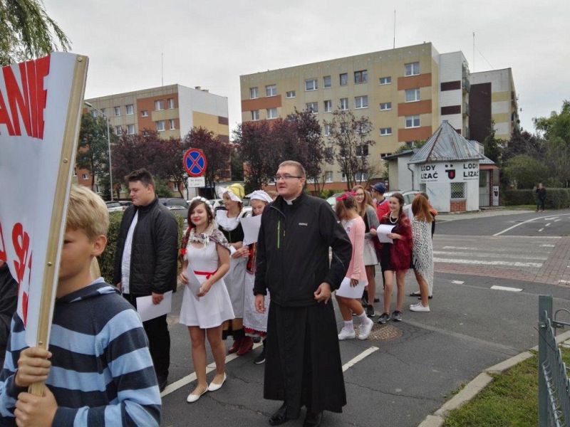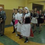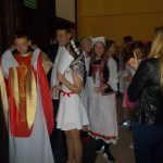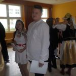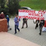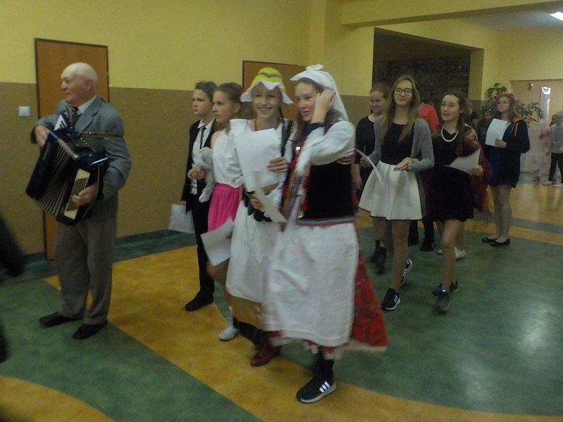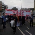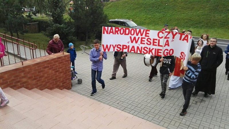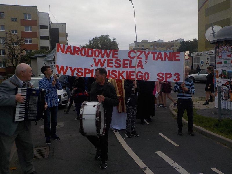 Orszak weselny na czele z księdzem, muzykantami, panną młodą i panem młodym przemaszerował przez szkolne hole, by zatrzymać się w sali audiowizualnej, gdzie odbyło się czytanie fragmentów „Wesela” Stanisława Wyspiańskiego.
