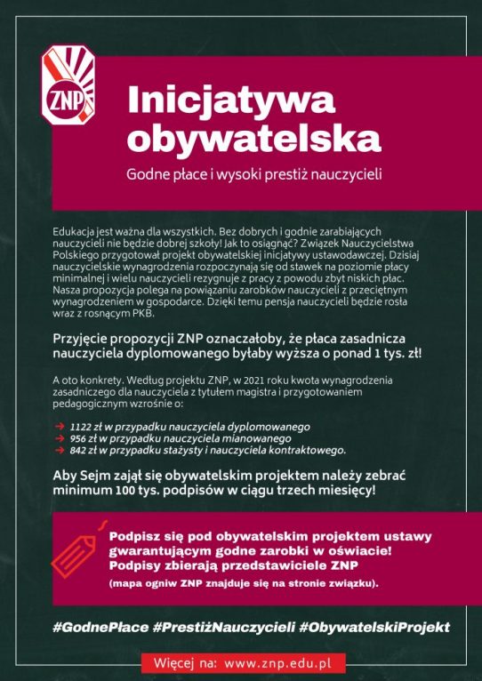 Obecnie nauczycielskie wynagrodzenia rozpoczynają się od stawek na poziomie płacy minimalnej i wielu nauczycieli rezygnuje z pracy z powodu zbyt niskich płac. O problemach kadrowych w szkołach pisaliśmy na początku września. Propozycja Związku Nauczycielstwa Polskiego polega na powiązaniu zarobków nauczycieli z przeciętnym wynagrodzeniem w gospodarce. Dzięki temu pensja nauczycieli będzie rosła wraz z rosnącym PKB. Przyjęcie propozycji ZNP oznaczałoby, że płaca zasadnicza nauczyciela dyplomowanego byłaby wyższa o ponad 1 tys. zł! Tego w dużej mierze dotyczy obywatelska inicjatywa „Godne płace i wysoki prestiż nauczycieli”, pod którą zbierane są właśnie podpisy.