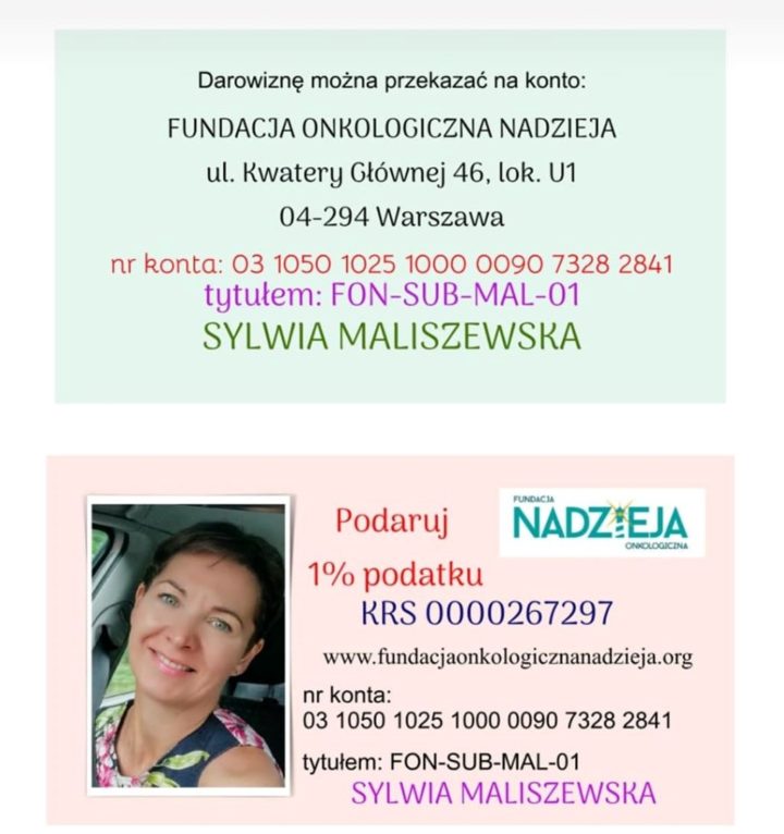 Pani Sylwia Maliszewska oraz jej bliscy bardzo proszą o pomoc. – Fundacja Onkologiczna Nadzieja jest w pełni legalna. W dodatku, pieniądze będą dla mnie dostępne szybciej. Proszę również o odpis 1%, ale pieniądze z odpisu będę mogła zobaczyć dopiero w październiku… Tutaj liczy się czas. Jeśli ktoś chciałby wspomóc mnie wcześniej to może to uczynić poprzez wpłatę darowizny. Pensja nauczycielska nie jest wysoka, jestem samotną mamą dwójki dzieci, a wszystko kosztuje – mówi lubinianka.