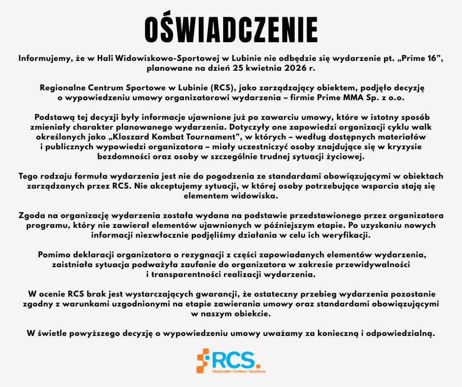 „Tego rodzaju formuła wydarzenia jest nie do pogodzenia ze standardami obowiązującymi w obiektach zarządzanych przez RCS. Nie akceptujemy sytuacji, w której osoby potrzebujące wsparcia stają się elementem widowiska” – Regionalne Centrum Sportowe wydało dziś oświadczenie w sprawie gali „Prime 16”, która miała się odbyć w lubińskiej hali. Jednocześnie poinformowało, że wypowiedziało umowę organizatorowi wydarzenia – firmie Prime MMA Sp. z o.o.