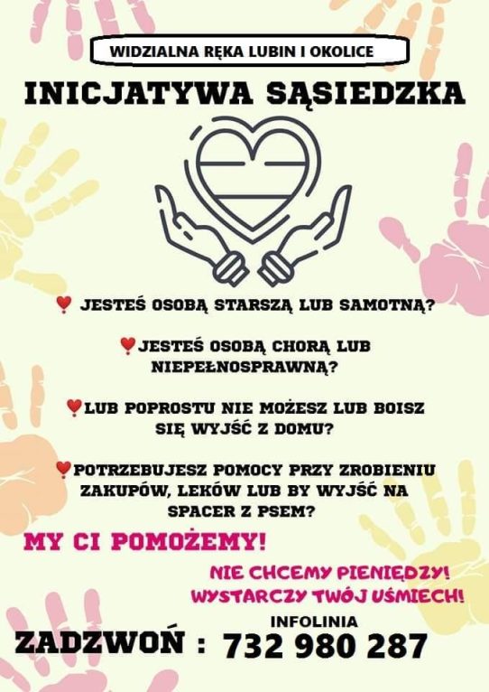 Potrzebujesz zrobić zakupy, wyprowadzić psa czy wynieść śmieci, ale z powodu panującej epidemii wolałbyś teraz nie opuszczać swojego mieszkania? Teraz możesz liczyć na pomoc. W Lubinie i okolicach działa specjalnie do tego stworzona grupa Widzialna ręka, zrzeszająca już ponad tysiąc gotowych do niesienia pomocy członków. Niedawno została uruchomiona infolinia, na którą mogą dzwonić wszyscy potrzebujący wsparcia. W Lubinie cały czas działa też wolontariat miejski, o czym pisaliśmy TUTAJ.