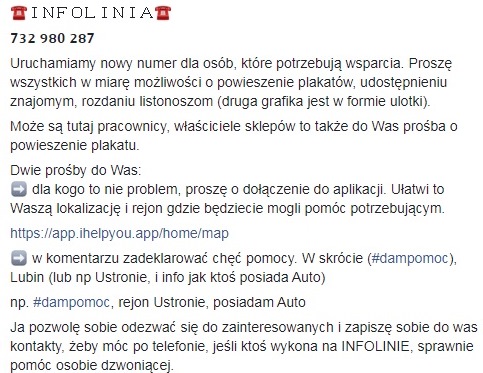 – Jest dużo osób które chcą pomóc, przez plakaty i infolinię liczymy, że osoby potrzebujące się do nas odezwą i będziemy mogli im pomóc – dodaje Przemysław Napora.