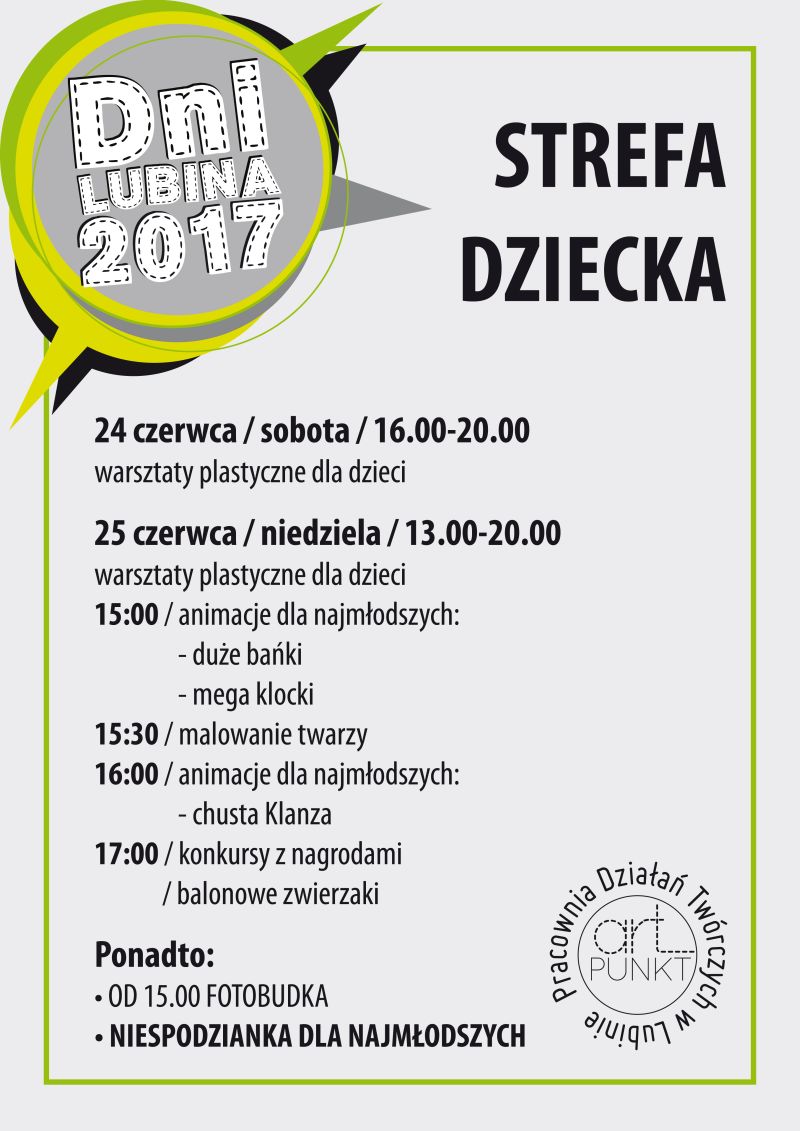 Organizatorzy pomyśleli także o najmłodszych, dla których działać będzie Strefa Dziecka. To miejsce zabaw i zdobywania umiejętności plastycznych, a także poszerzania wiedzy na temat naszego miasta. Blok warsztatów twórczych bowiem poświęcony będzie tematyce związanej z historią oraz zabytkami Lubina. Zajęcia w Strefie Dziecka są bezpłatne i otwarte dla wszystkich. A oto program warsztatów: