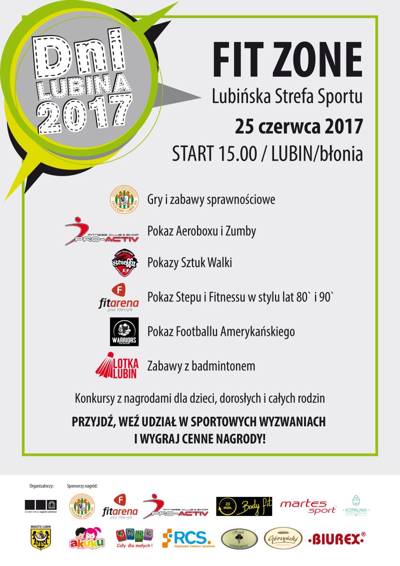 W programie strefy są: gry, zabawy, konkursy i pokazy różnych form aktywności fizycznej takich, jak zumba, aeroboks czy futbol amerykański. W Strefie Fit Zone można będzie także uzyskać porady od trenerów czy dietetyków na temat programów treningowych, konkretnych ćwiczeń jak również prawidłowego odżywiania. Lubińska Strefa Sportu Fit Zone jest przygotowana z myślą o wszystkich rodzinach żyjących lub chcących zacząć aktywnie. Najlepszą formę aktywności sportowej czy zabawowej z pewnością znajdzie tu dla siebie każdy. Będą propozycje zabaw i pokazów zarówno dla dzieci, młodzieży, jak i dorosłych, krótko mówiąc: dla całych rodzin.