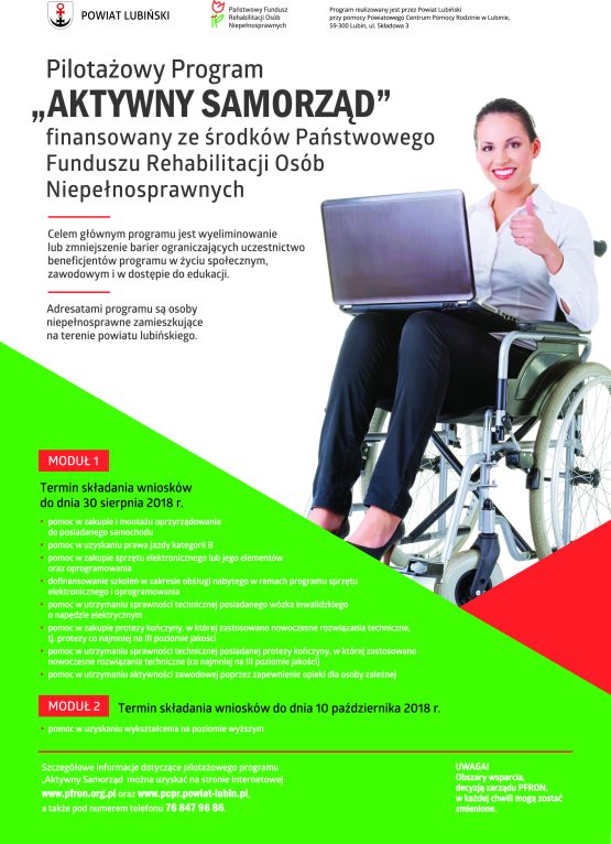 Pilotażowy program „Aktywny Samorząd” – MODUŁ I finansowany jest ze środków PFRON. Termin składania wniosków trwa do 30 sierpnia 2018 r.