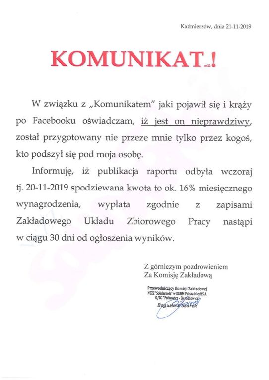 – Ktoś podszył się pod moją osobę. Podrobiono cały komunikat, w którym spreparowano nawet pieczątki. Oczywiście informacja była nieprawdziwa – twierdzi Bogusław Szarek, przewodniczący Komisji Zakładowej NSZZ „Solidarność” w KGHM Polska Miedź i członek rady nadzorczej KGHM z wyboru załogi. To jego nazwisko znalazło się pod rzeczonym pismem. – Sprawa została zgłoszona do wydziału bezpieczeństwa przy ZG Polkowice-Sieroszowice oraz do prokuratury. To było działanie na rzecz szkodę związku oraz całej miedziowej spółki – dodaje.