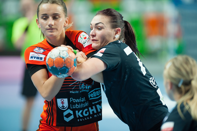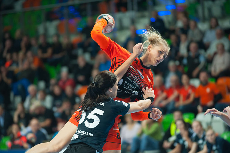 Przyjezdne rozpoczęły mecz od szybkiego 2:0, ale dwa atomowe rzuty z drugiej linii autorstwa Klaudii Pielesz dały Miedziowym remis. Obie drużyny grały twardo w obronie, czego efektem był niski wynik. Swoją trzecią bramki Metraco Zagłębie zdobyło w piętnastej minucie zmniejszając straty na 3:4. Podopieczne Bożeny Karkut i Renaty Jakubowskiej dogoniły rywalki przed upływem dwudziestej minuty, jednak wynik wciąż był na „styku”. Lepszy okres gry wykorzystały koszalinianki, wychodząc na 4-bramkowe prowadzenie pięć minut przed końcem pierwszej połowy, ale szybko sygnał do ataku dała Marketa Huryhova i Miedziowe w niespełna dwie minuty odrobiły straty do rywalek. Na pierwsze prowadzenie w meczu lubinianki wyszły pod koniec pierwszej połowy, kiedy bramkę zdobyła Zuzanna Ważna, która bardzo dobrze radziła sobie na kole. Do przerwy Metraco Zagłębie prowadziło skromnie, jednak wyszło ze sporych opresji.