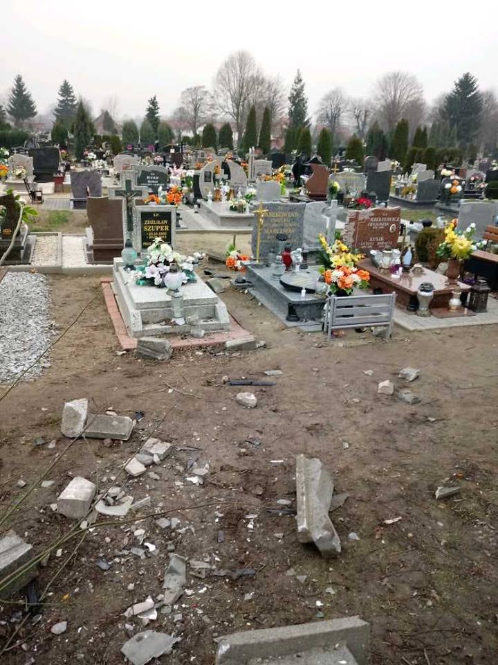 Jechał z taką prędkością, że wbił się w betonowe ogrodzenie cmentarza, uszkadzając przy tym nagrobki. Kierowca busa był nietrzeźwy.