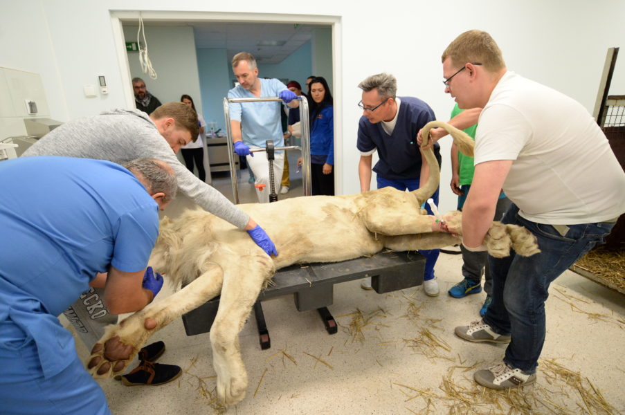 Dwuletniemu, ważącemu 160 kilogramów Leonowi, który na co dzień zamieszkuje Zoo Safari w Borysewie, trzeba było wykonać rezonans magnetyczny z powodu wypadku, którego doznał kilka dni wcześniej. Biegając, uderzył głową w konar i zachodziło podejrzenie wstrząśnienia mózgu albo uszkodzenia kręgów.