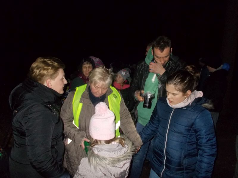 Po warsztatach nastąpił oczekiwany przez wszystkich moment, czyli wyjście w teren w poszukiwania sów. Znany przyrodnik Andrzej Szlachetka, który przez cały czas wspomagał swoją wiedzą i doświadczeniem przewodnika Nocy Sów Mariusza Mostowskiego poprowadził uczestników przez Ekomuzeum Osady Rybckiej Dziewin, po drodze wabiąc sowy, naśladując ich głosy.