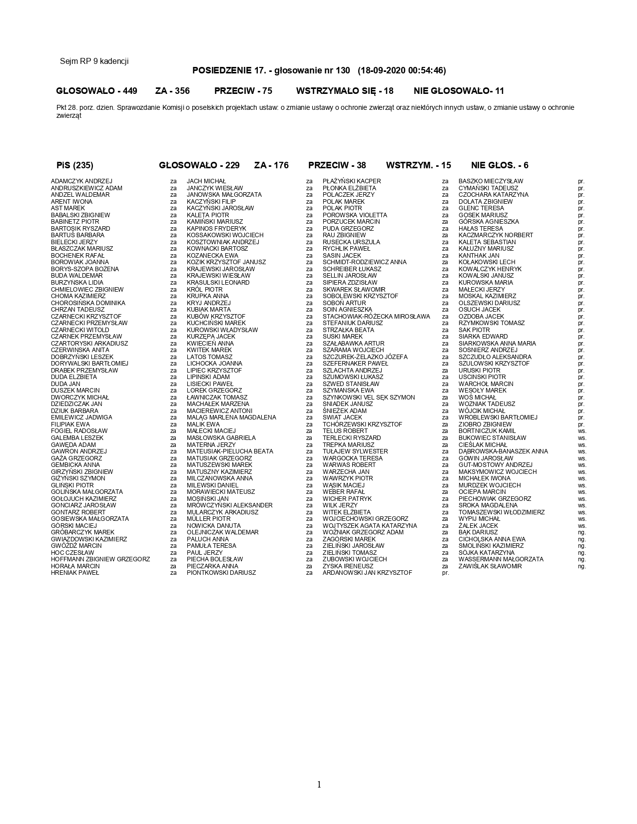Zbiór przepisów, nazywany „piątką dla zwierząt”, którego wprowadzeniu w życie orędował sam Jarosław Kaczyński, został przyjęty przez Sejm, ale niejednomyślnie. Przeciwko zagłosowało 75 posłów, z których 38 to przedstawiciele klubu PiS (w tym wszyscy posłowie Solidarnej Polski i dwóch Porozumienia). Oprócz tego 15 posłów Porozumienia wstrzymało się od głosu.