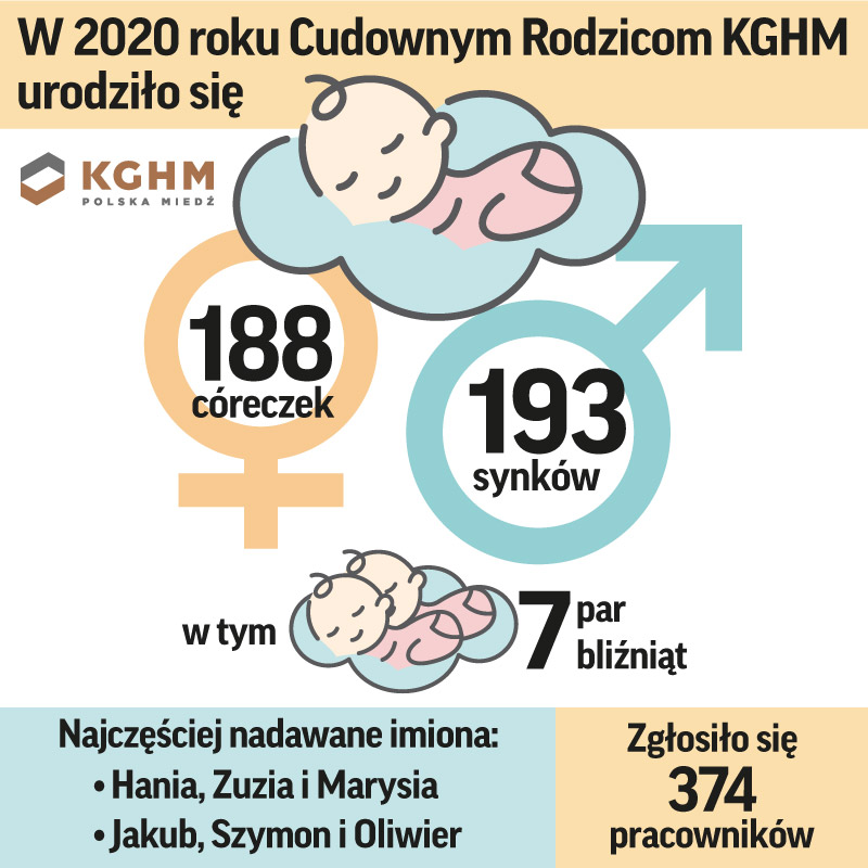 Nowo narodzone dzieci pracowników Polskiej Miedzi to 188 córeczek i 193 synków, w tym siedem par bliźniąt. Dziewczynkom najczęściej nadawano imiona: Hania, Zuzia i Marysia, a chłopcom: Jakub, Szymon i Oliwier.