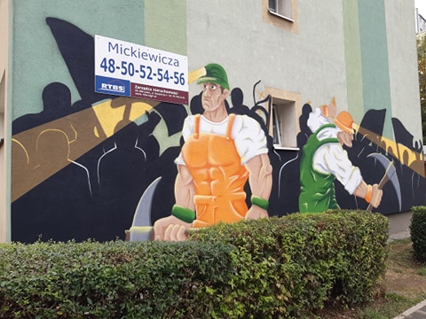 Kolejne dzieło można już zobaczyć w centrum miasta. To z kolei inicjatywa stowarzyszenia Zagłębie Fanatyków. Na muralu widzimy krecika z zaciśniętymi zębami, obok logo klubu Zagłębie Lubin, a także górnika i lubiński ratusz.