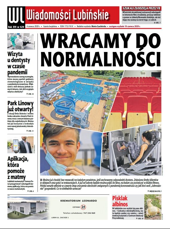 Już jutro, 4 czerwca, ukaże się kolejny numer „Wiadomości Lubińskich”. Piszemy w nim między innymi o kolejnym etapie znoszenia obostrzeń przez polski rząd oraz otwarciu kin i Parku Linowego w Lubinie.