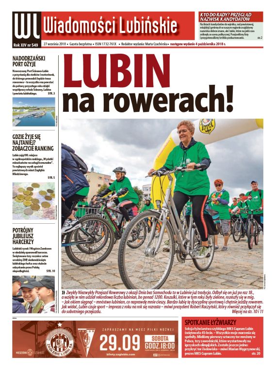 Już jutro (27 września) ukaże się nowy numer „Wiadomości Lubińskich”. Tym razem okładkę najstarszego tygodnika w mieście zdobi zdjęcie ze Zwykłego Niezwykłego Przejazdu Rowerowego. Na dwóch stronach prezentujemy galerię z tej sympatycznej, już „pełnoletniej” imprezy.