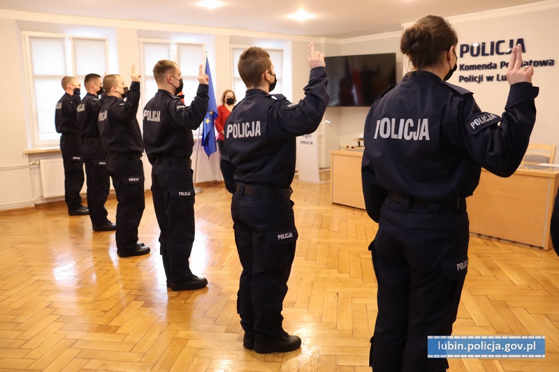 Ślubowanie od nowych funkcjonariuszy przyjął zastępca Komendanta Powiatowego Policji w Lubinie nadkomisarz Marek Szczepański. W uroczystej zbiórce uczestniczył również bezpośredni przełożony mundurowych.