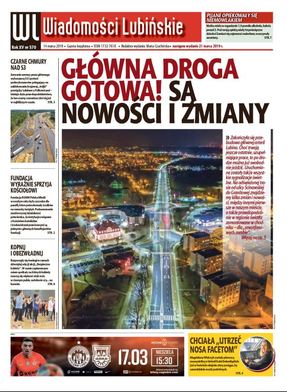Już jutro, 14 marca, ukaże się kolejny numer bezpłatnego tygodnika „Wiadomości Lubińskie”. Przeczytacie w nim między innymi o zakończeniu jednego z największych remontów drogowych w Lubinie i nowościach, jakie pojawiły się na ulicach, między innymi światłach dla „smartfonowych zombie”.